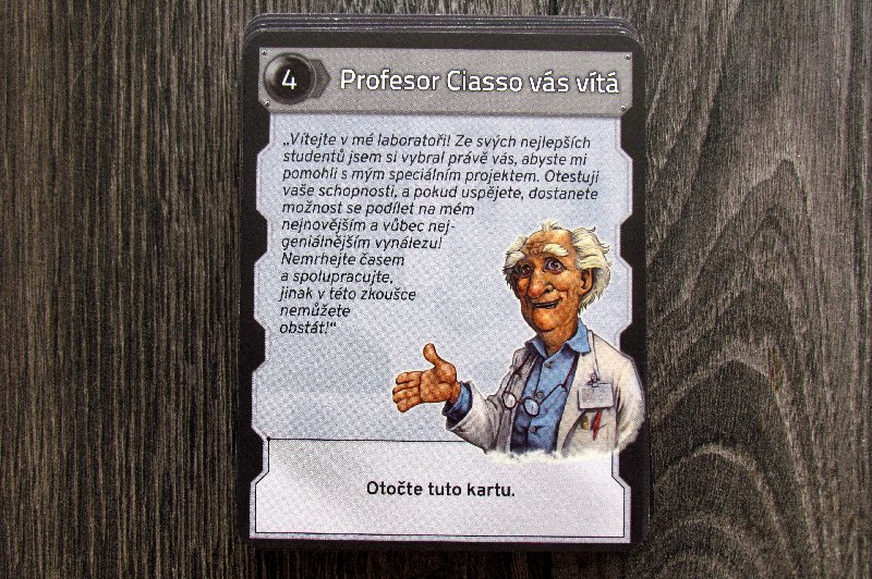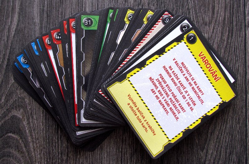 Jedná se o malý box plný karet. Na jejím víku vidíte různé šifry, zámky a kosmonautskou helmu. To všechno ve vás vzbudí zvědavost a také očekávání. Zase úkoly, které je třeba vyřešit týmovou spoluprací a logickým uvažováním. A uvnitř je balíček karet, který je obalený do dvou varování, abyste náhodou nenahlédli do jeho nitra dřív.
